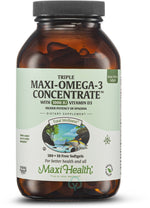 Maxi Health Research is proud to provide you with Triple Maxi Omega 3 Concentrate with D3. The fish oil is encapsulated in a kosher, enteric, vegetarian soft gel. Easy to digest and has no aftertaste.