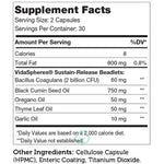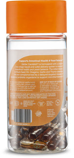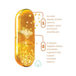 The initial release of Black Seed Oil, Oregano, Garlic and Thyme essential oil are complemented by a delayed targeted release of beneficial probiotic organisms to support microbial balance.